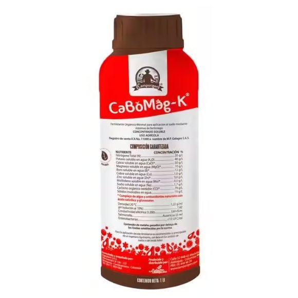 CaBoMag-K® es un fertilizante orgánico-mineral formulado para aplicación al suelo mediante sistemas de fertirriego. Su composición balanceada incluye nitrógeno y potasio, junto con calcio, magnesio y oligoelementos como boro, molibdeno, cobre y zinc, además de carbono orgánico oxidable. Este complejo nutritivo favorece procesos vitales como floración, cuajado y llenado de frutos, al tiempo que mejora atributos poscosecha y estimula la actividad microbiana del suelo.