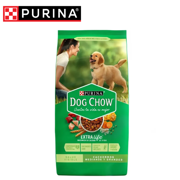Dog Chow Cachorros Razas Medianas y Grandes es un alimento seco desarrollado para cubrir las necesidades nutricionales específicas de los cachorros desde el destete hasta los 18 meses de edad. Su fórmula balanceada aporta proteínas de calidad, calcio y nutrientes esenciales que favorecen el desarrollo de huesos, músculos y dientes fuertes.
