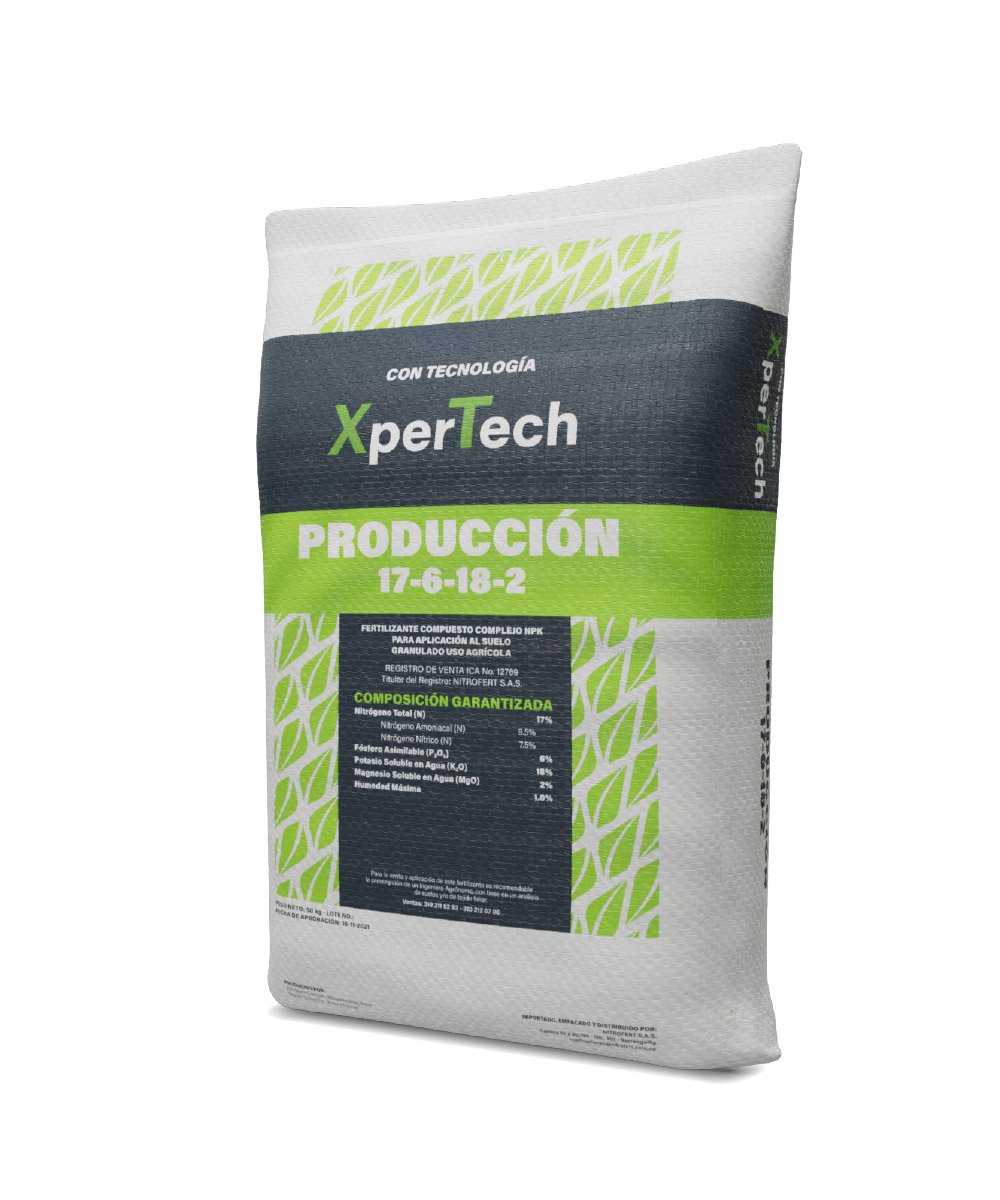 Nitrosoil Producción 17-6-18-2 es un fertilizante granulado NPK con magnesio, desarrollado con tecnología XperTech para ofrecer una nutrición eficiente, balanceada y con liberación progresiva en cultivos de mediana y alta demanda.