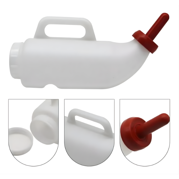 Tetero resistente y práctico para terneros, con tetina flexible que facilita la alimentación segura y natural.